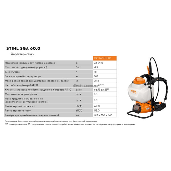 STIHL SGA 60.0 (SA10-0117-004) - акумуляторний обприскувач створений для вибагливих приватних користувачів та напівпрофесійного застосування й повністю позбавляє від потреби ручного накачування — внесення засобів відбувається рівномірно під постійним тиском.