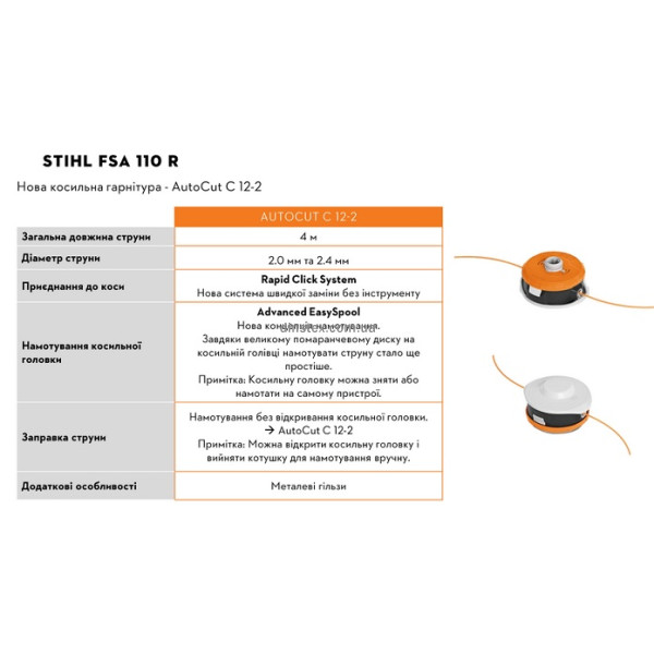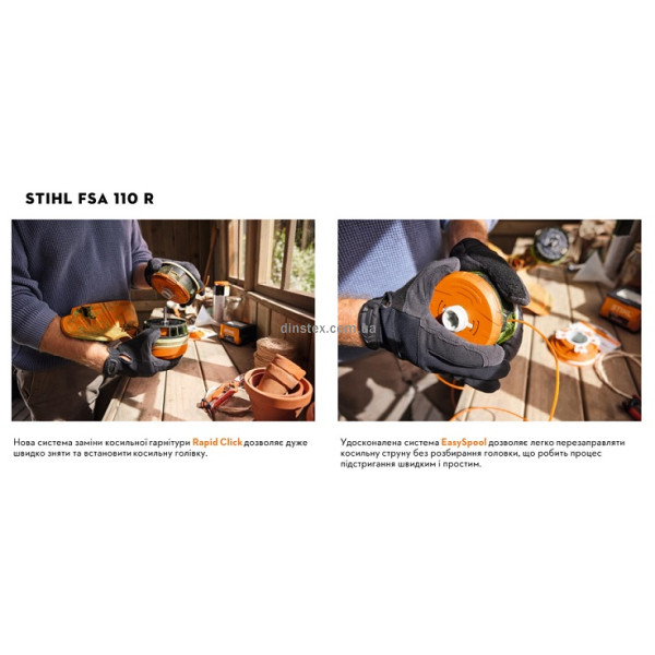 STIHL FSA 110 R (FA07-011-5723) - потужна акумуляторна коса в системі AP із прямим приводом, для якого передбачено дві нові косильні головки. Їх можна зняти натисканням кнопки та за допомогою безінструментної системи швидкої заміни Rapid Click System усього за кілька секунд.